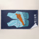 Create a personalised gift that's perfect for water-skiers and water sports enthusiasts. This beach towel features an illustration of a water-skier in orange, light blue and teal blue set in the shape of a life jacket vest against a navy blue background. Below is a spot to add a name in white lettering.