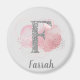 Pretty Initial / Monogram design features silver glitter letter F with abstract watercolor pink background and customisable text to add name or other message.