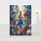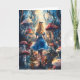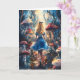 A whimsical watercolor design featuring Alice walking along a woodland path lined with red cap mushrooms, capturing the magical charm of Wonderland.