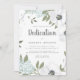A beautiful floral dedication invitation suitable for a little boy or girl. This design features a surrounding frame of watercolor white anemones, green leaves, and delicate blue flowers on a white background. The word "Dedication" is in dark grey modern brush lettered style font, and your event details are in modern sans serif font. The reverse is in solid light blue with vertical white stripes.