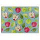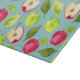 This is a pattern of apples. There are green and red apples. One is cut in half. There are also some leaves mixed in the pattern. The apples were coloured in watercolor.