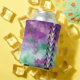 Purple, green watercolor can cooler with black and white arrowheads design.