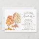 This romantic Fall inspired wedding invitation features a watercolor style image of a park. Golden trees with falling leaves create a canopy over a cosy park bench and street lamp. Coloured leaves are nestled beneath the trees, creating a perfect Autumn scene.