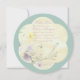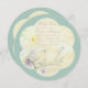 A unique baby shower invitation featuring a watercolor little bird on a branch. The overall flower shape is layered onto a blue-green background.