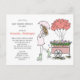 Whimsical illustrated pregnant mum painted pink baby sprinkle baby shower with balloons and mum with umbrella and rain boot galoshes. A baby shower invite for your next baby.