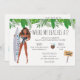 Tropical bachelorette beach party weekend invitation features watercolor dark skin tone girl with surf board. Event details on back of invitation. Can be customised for any event.