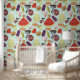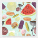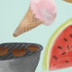 Watercolor picnic design for a kitchen accent wall; grill, hamburgers, hot dogs, watermelon, lemonade, corn on the cob, ice cream and popsicles.