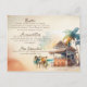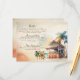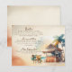 Elegant watercolor wedding enclosure cards in moody vintage tones with people and a bar shack and palm tree.