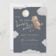 We can bearly wait! Cute teddy bear theme baby shower invitation featuring a watercolor illustration of a bear cub holding a balloon with some clouds and stars around it. Handwritten script and elegant typography complement the design placed against an off-navy blue background. This invitation is great for a gender-neutral shower in the fall.