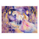 A stunning princess in a flowing gown and majestic white unicorn through a golden-lit forest. Dreamlike boho watercolor artwork full of fairytale charm.