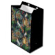 Christmas gift bag depicts a beautiful watercolor design with a bird sitting on a lantern surrounded by pine, red and purple berries, winter leaves and holiday decorations with a dramatic black background.