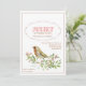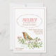A beautiful little bird, with a brown breast and yellow wings, is perched on a delicate branch with pink blossoms. A sweet invitation for just about any happy celebration.