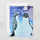 This postcard features a watercolor painting of a cute pair of penguins beneath a starry Antarctica sky, with a background of icy glaciers.