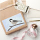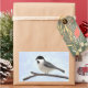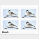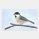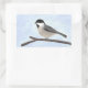 Sticker with my original digital watercolor illustration of a Black-capped Chickadee perched on a leafless twig against a pale blue sky.
