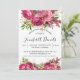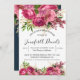 Modern elegant floral bridal shower invitation features a top and bottom border of blush pink, rose and gold flowers, with lush botanical foliage and greenery. Personalise with your bridal shower details in modern hand lettered script and traditional sans serif lettering. Invitations reverse to rich navy blue with floral accent.