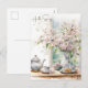 Celebrate the beauty of spring with this soft, painterly Hello Spring watercolor postcard featuring delicate pink blossoms arranged in a vintage ceramic pitcher beside a cosy tea setting. Rendered in an airy pastel palette of blush pink, powder blue, sage green, cream, and warm neutrals, this artwork captures the charm of cottagecore and European-inspired still life illustration.