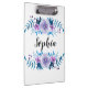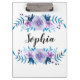 Clipboard with romantic blue & purple watercolor floral wreath design and customisable name or monogram.