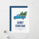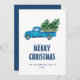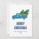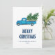 Vintage blue truck Merry Christmas card featuring a watercolor illustration of a blue truck carrying Christmas trees.