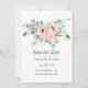 Bohemian wedding save the date card featuring eucalyptus leaves and florals in accents of pink and sage green.