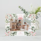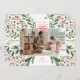 An elegant one photo holiday card features original watercolor botanical illustrations and a red ribbon on top.