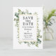 Modern Elegant Watercolor Botanical Greenery Save The Date Card includes eucalyptus leaves and botanical greenery foliage on a gold frame.