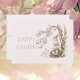 Easter greeting card featuring a watercolor illustration of a bunny guarding a nest of colourful pastel Easter eggs below a flowering magnolia tree blooming in pink and white watercolor flowers all set on a soft pink background. Bold script Happy Easter to the left of illustration in a green font to match. A smaller version of the illustration is repeated on the bottom right on the back of card with room for a personal handwritten note. Additional sizes available.