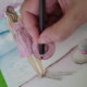 "By the Shoreline" is one of my newest watercolor paintings of beach scenes, capturing a serene moment with soft pink artwork tones and a calm blue sea. This emotional piece of beach art features a woman at the water’s edge and a second beach hat resting in the sand—offering a quiet, symbolic glimpse of connection and reflection.