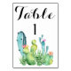 A beautiful blue and green watercolor cactus wedding party table number. This custom boho design features cactuses, cacti and succulents and is perfect for the reception.