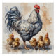 A watercolor Chicken with chicks portrayed against a soft, blurred background. The natural colours enhance the lifelike appearance.