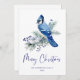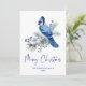 This winter themed personalised Christmas card features a watercolor blue jay perched on snow covered pine boughs with sprigs of blue berries.