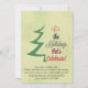 This holiday invitation features an abstract half Christmas tree against a green, watercolor background with the main text written in modern type. Perfect for Christmas and holiday party invitations and holiday dinner party invitations.