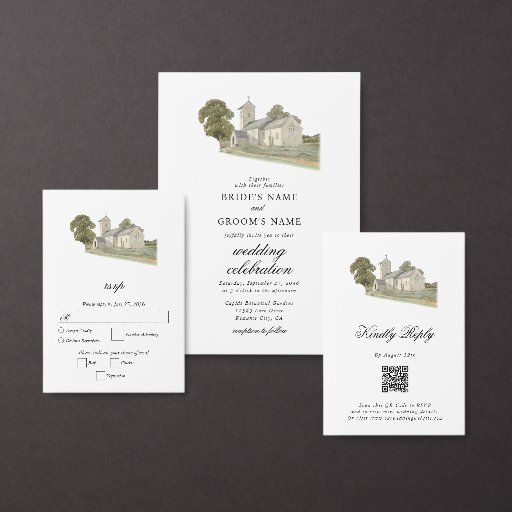 A minimalist watercolor church wedding design. A traditional church design that uses an elegant classic typography and calligraphy. A charming Christian church monogram design with modern classy typography. An elegant traditional church themed vellum wedding invitation design with modern elements. Matching wedding stationery items and other wedding invite formats are also available.