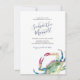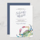This elegant beach theme engagement party invitation features your names set in a stylish handwritten script typography with event details in a classic charcoal grey serif font on a crisp white background. My original watercolor crab in shades of reds, blues and greens adorns the front. The invite card reverses to a complimentary navy blue colour. A coastal chic yet elegant choice for casual seaside New England beach, nautical or summer engagement parties. To see my entire wedding stationery suite visit DoTellABelle on Zazzle.