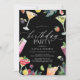 Fun adult birthday party invitations with watercolor illustrations of cocktails. Fruit, drinks, berries, and tropical plants frame your event details. The reverse side has a pink-orange watercolor effect. Colourful drinks on a contrasting black background.