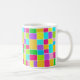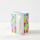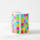 A mug with a colourful abstract digital watercolor design, made up of colour rectangles each painted so that none of the coloured rectangles touch, leaving a narrow strip of white paper. The painting was created using Artrage Studio Pro which gives a very fresh and realistic watercolor effect in beautiful vivid colours. The motif is repeated on both sides of the mug.