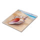Ceramic tile in a watercolor-design of a large conch shell resting on a sunlit beach. Soft pastel tones and gentle details give it a dreamy, relaxed feel. The ocean’s turquoise blues and fluffy clouds in the background add to the peaceful, tropical feel.