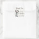 These square wedding favour stickers have a rustic farmhouse feel to them and use a warm winter white watercolor paper background look to showcase the watercolored grey tin water pitcher that is holding a bouquet of white and brown cotton stems with the words, "Thank You" in dark brown across the top. The names of the bride and groom are dark brown with a single cotton branch below. The wedding date is printed in abbreviated format below in grey-green. If you need help customising the wording, please email me at niteowlstudio@gmail.com or use the Zazzle chat feature and I'll be happy to help.