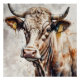 A Cow with detailed watercolor with expressive eyes is portrayed against a soft, blurred background. The natural colours enhance the lifelike appearance.