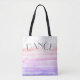 Watercolor design pretty pink and purple painted stripes with text in grey dance tote. Art copyright Ann Powell all rights reserved.