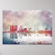 The is a digitally enhanced photograph of the Detroit Skyline made to look like a watercolor painting of Detroit.