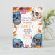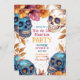 This invitation's combination of bluish sugar skulls, vibrant patterns, and a crisp white background creates a modern yet festive way to celebrate Día de Muertos. Perfect for setting the tone for a memorable and stylish event.