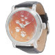 Watercolor dog paw tracks in white, red and orange with paint splatter effect applied to the image. Custom watches with original design. Gift idea for dog lovers.