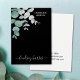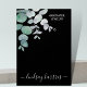 This unique jewelry display card is decorated with watercolor eucalyptus leaves on a black background.