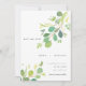 An elegant and modern save the date card features hand painted watercolor illustrations of Silver Dollar Eucalyptus leaves for romantic and boho weddings.