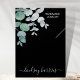 This unique jewellery display card is decorated with watercolor eucalyptus leaves on a black background.