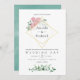 Trendy geometric eucalyptus greenery and blush pink roses wedding invitation with gold geometric frame and mint watercolor wash reverse.