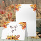 Fall thank you note featuring watercolor fall florals, sunflowers, fall leaves and berries in orange, red and yellow hues. The script Thank You displayed on front in a font colour to match illustrations. The florals border are repeated on top inside and bottom inside intentionally left blank to provide space for a personal note. Available in two sizes.