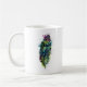 a colourful peacock feather tattoo design in ink and watercolors on a coffee mug