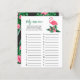 Baby shower invitation design features pink flamingo with lush green palm leaf fronds and tropical hibiscus flowers. "Aloha Baby". A tropical floral pattern with black background colour dresses up the back of the card.
