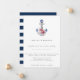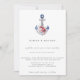 Beautiful watercolor rope and floral embellished anchor with navy blue and white stripe pattern backing, nautical themed wedding invitation.